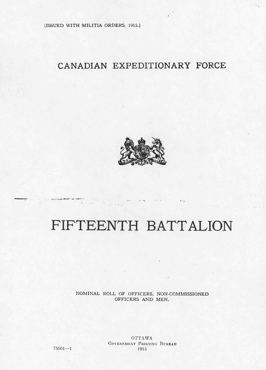 When the 15th Battalion was formed at Valcartier 1914, it was allocated a block of regimental numbers – 27001 to 28500 – to assign to its original members. With the exception of a small handful of attached Army Medical Corps personnel, all the men on the original Nominal Roll have numbers that fall within the allocated range.